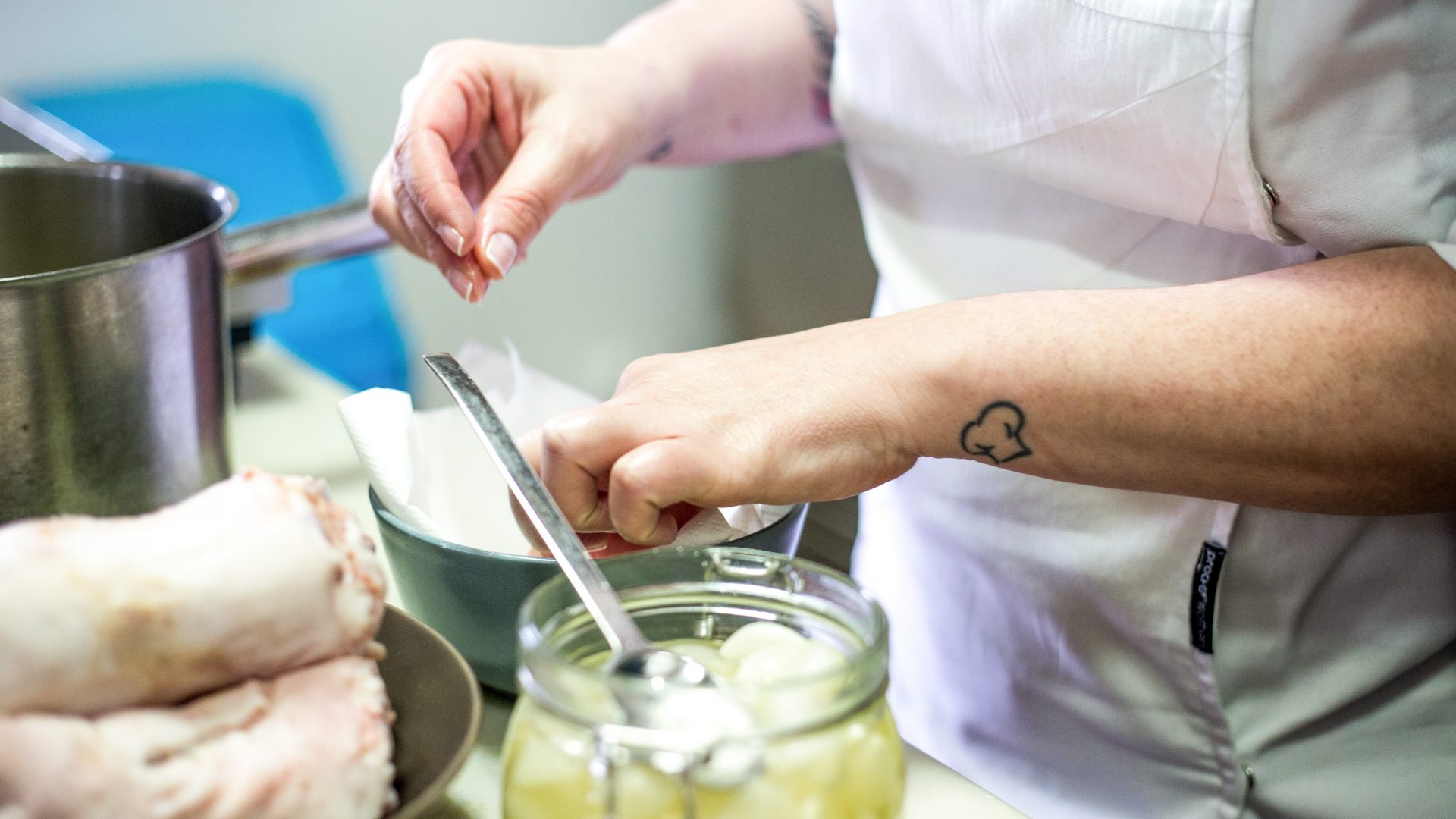Ali, abriu o seu restaurante, a Mercearia Gadanha, onde combina os ensinamentos da avó e da mãe com os da sua tia de coração, a dona Manuela. Entre muitos, os Pezinhos de Coentrada foi um dos pratos que Michele aprendeu com esta tia, e que tem reinterpretado à sua maneira com um toque mais fresco.