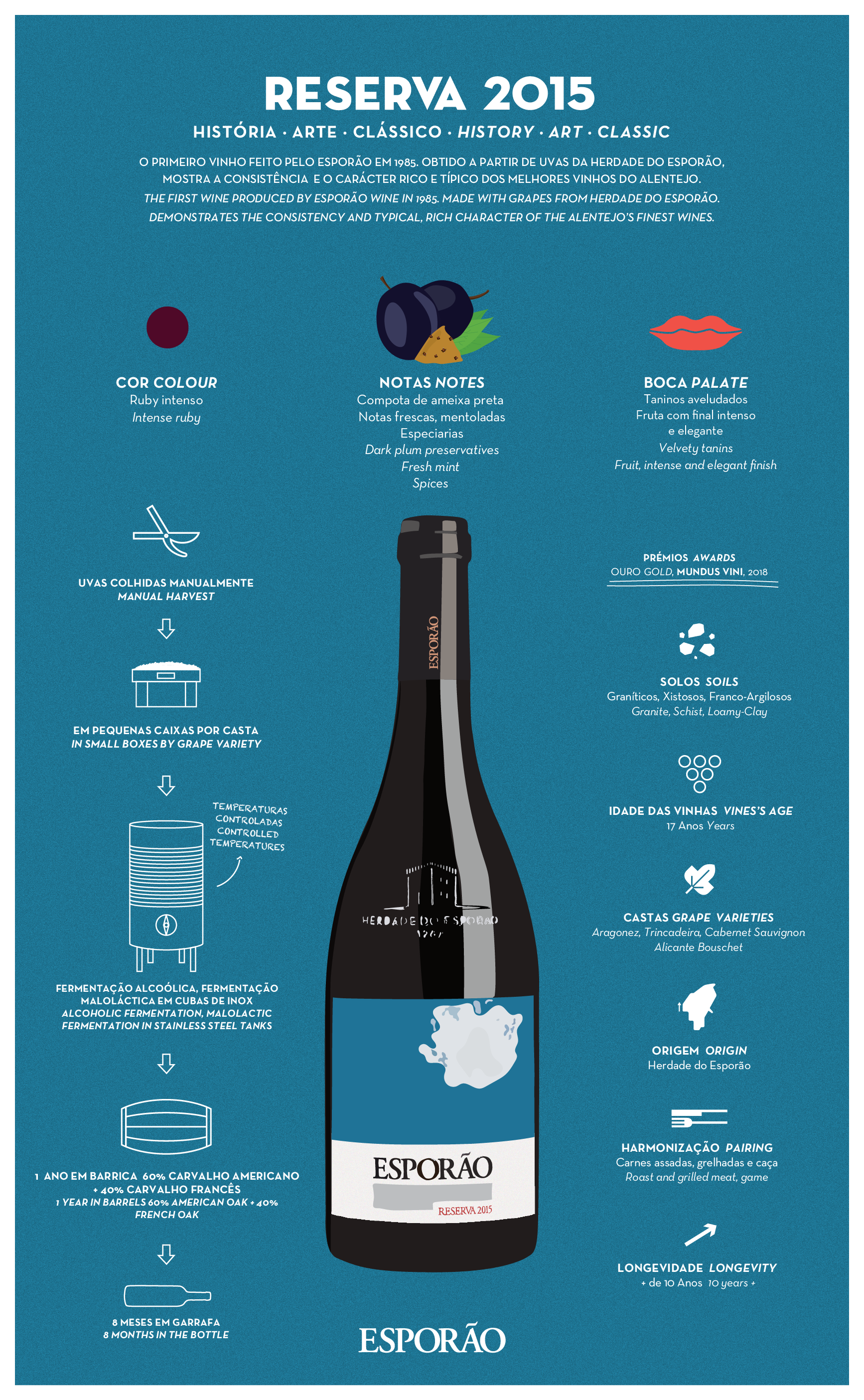 O Esporão Reserva foi o primeiro vinho produzido pelo Esporão, em 1985. Nasceu da nossa vontade de produzir os melhores vinhos no Alentejo. Ao longo dos anos, foi um vinho que nos levou a inovar, a crescer, a olhar para a nossa origem, a preocupar-nos com a natureza e a ver mais além. Adoptámos práticas agrícolas sustentáveis, mais recentemente convertemos todas as nossas vinhas para agricultura biológica, construímos novas adegas e viajámos para outros mercados, levando o Alentejo e Portugal para o mundo.